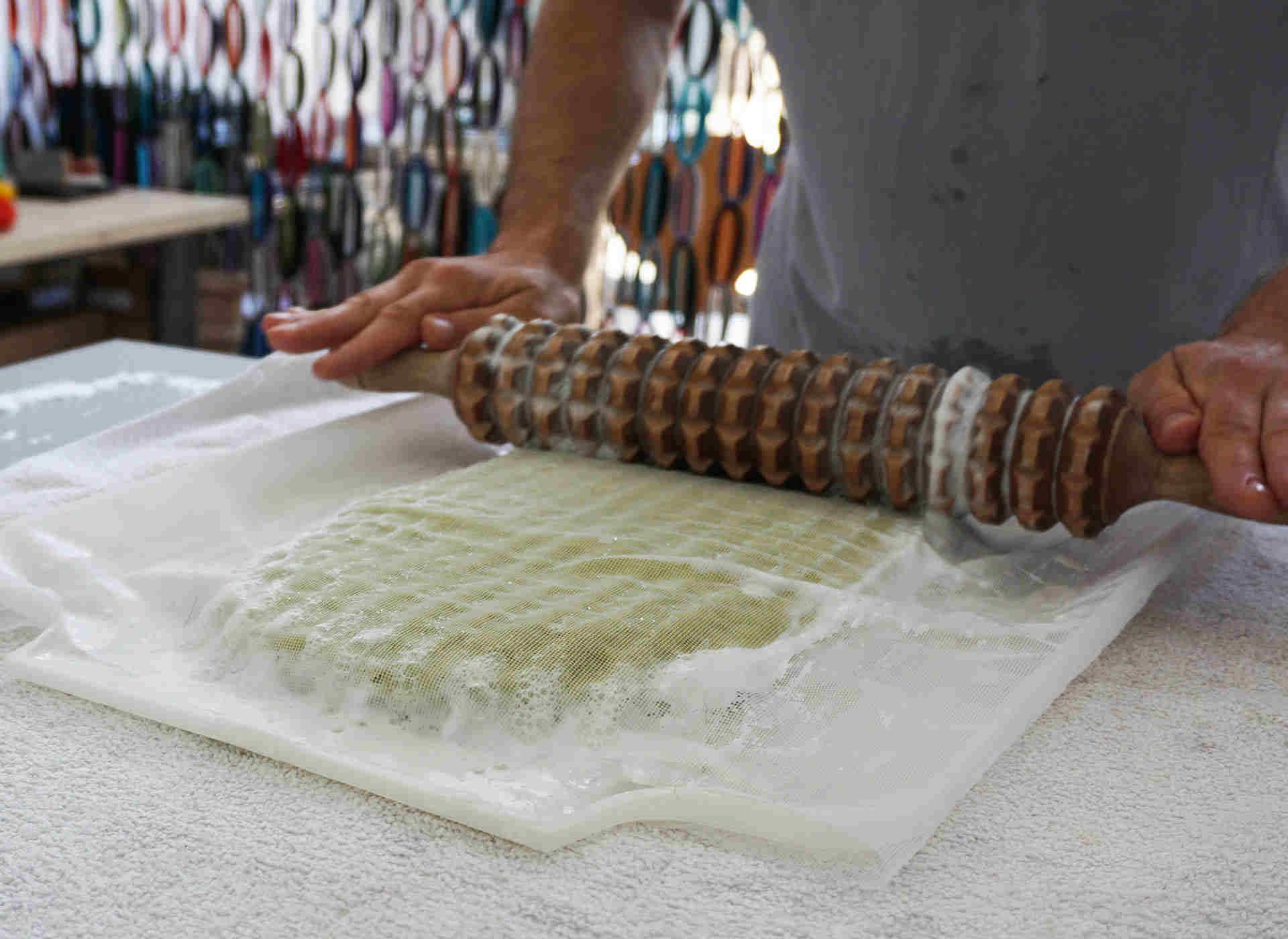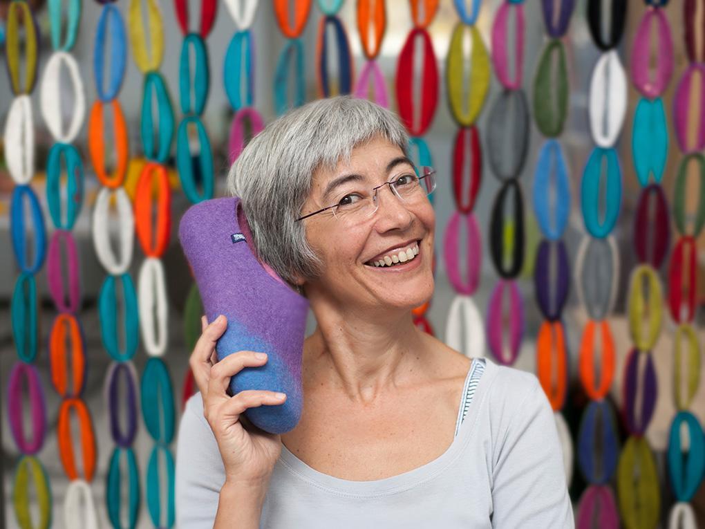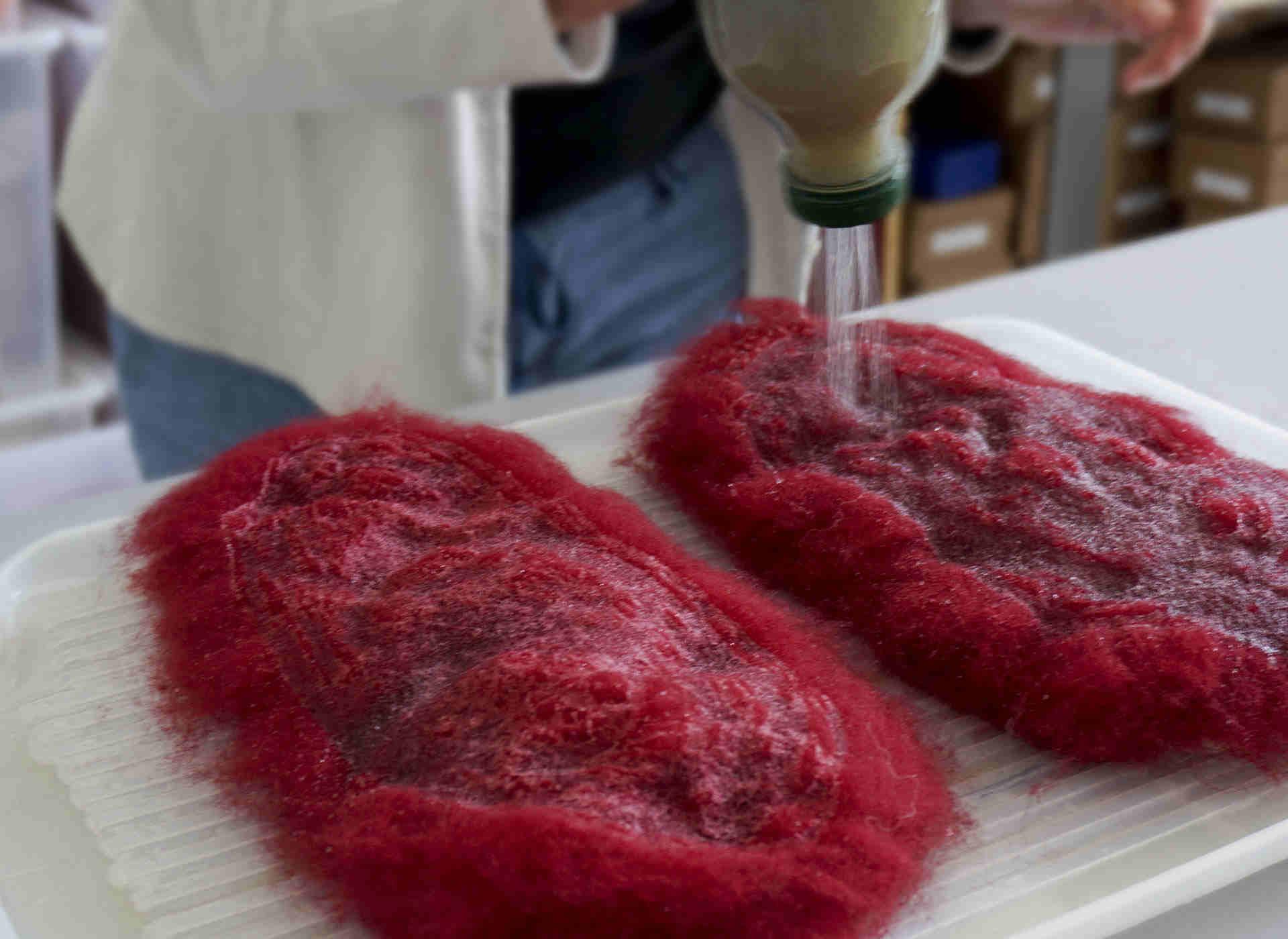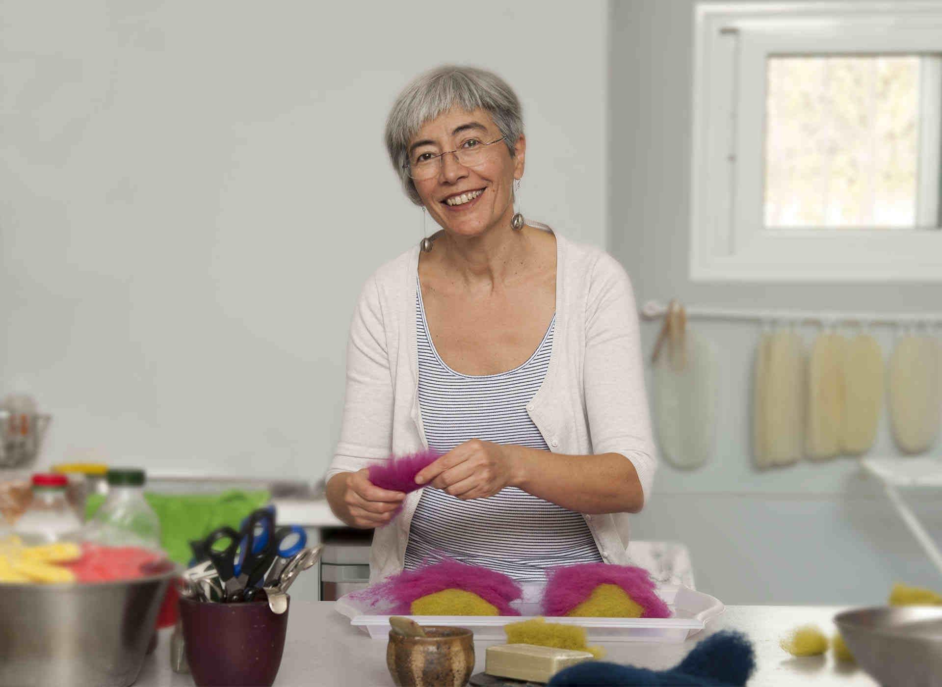 Παράγουμε με τη μέθοδο wet felting: Τρίβουμε το μαλλί με πράσινο σαπούνι και νερό, ώστε οι μικροσκοπικές ακίδες στην επιφάνειά των ινών του να «δέσουν» μεταξύ τους, σχηματίζοντας το υλικό μας, δηλαδή τη χειροποίητη τσόχα. Η τσόχα αυτή “φορμάρεται” γύρω από τα καλαπόδια μας ώστε να πάρει το κατάλληλο σχήμα. Έτσι χρησιμοποιούμε μια αρχαία τεχνική για να φτιάξουμε ένα σύγχρονο, μοναδικό αντικείμενο καθημερινής χρήσης!