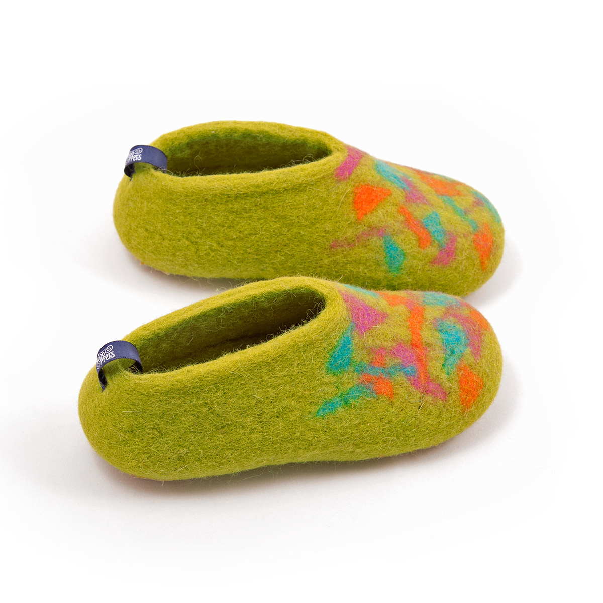 Μάλλινες παιδικές παντόφλες λαχανί με πολύχρωμο ντεκόρ.