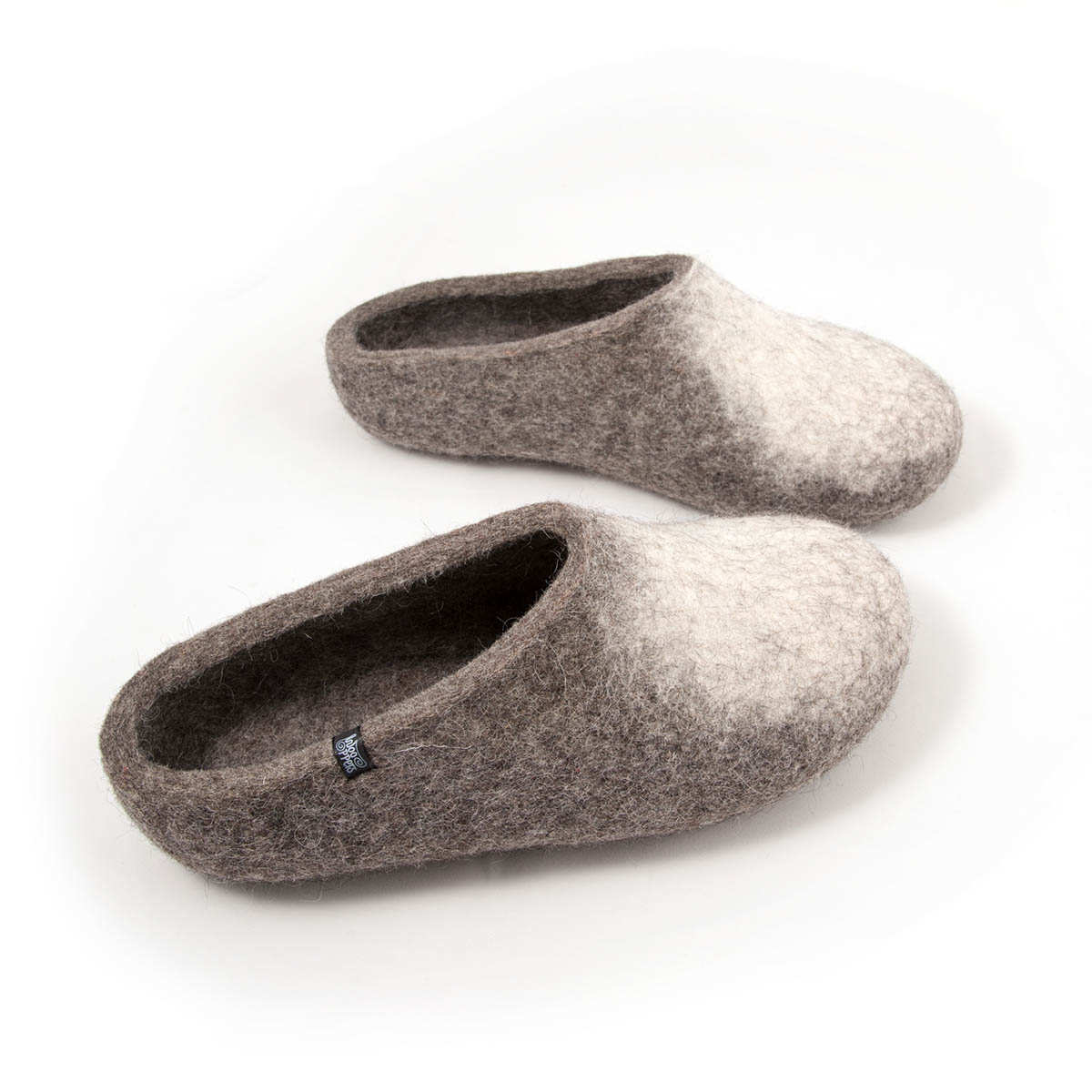 To make these mens slip on slippers we use naturally grey, organic, mountain sheep wool and decorate them with a splash of color at the front.