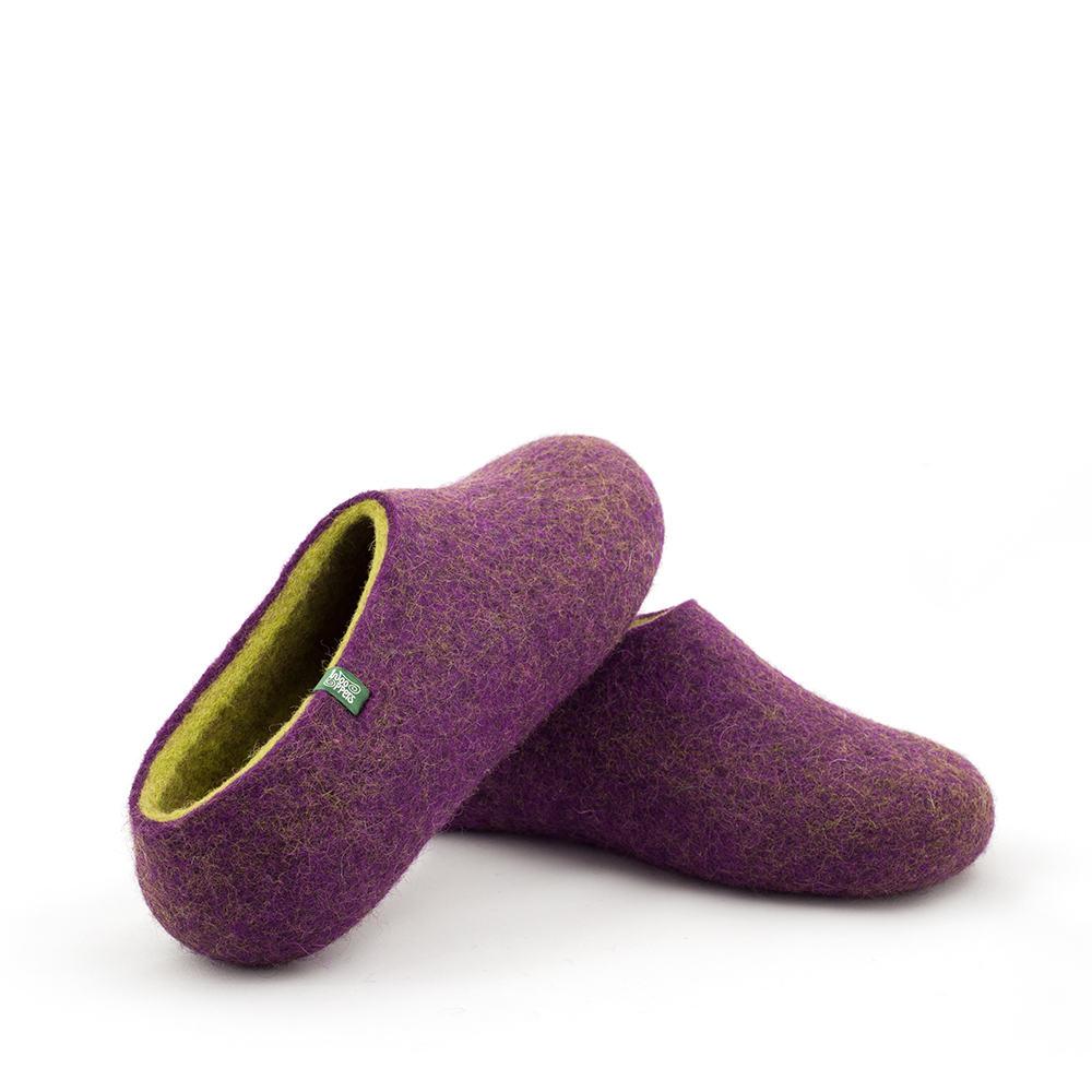 This coming season our purple slippers take warm aubergine shades. Fibers of purple mountain sheep wool intermingle with the fibers of the inner wool and produce rich sophisticated shades.